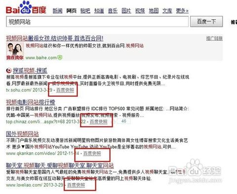 2、怎么找到百度快照?打開 www.baidu.com 輸入你要查找的關鍵詞,比如說視頻網站。可以看到在紅色方框表中的區域有百度快照的字樣。鼠標單擊百度快照就能打開瀏覽網頁了, 百度快照的服務穩定,下載速度極快,您不會再受死鏈接或網絡堵塞的影響。