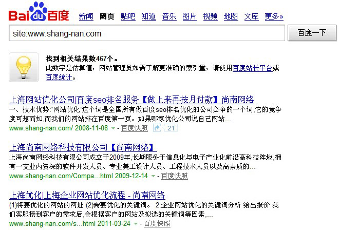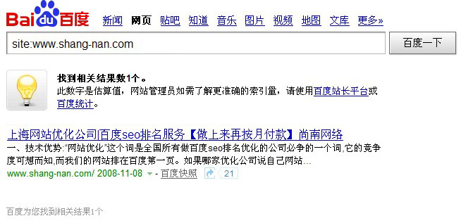 第一、首先通過site:指令來查詢網站收錄變化,比如說你的網址是www.029jiex.com,就在百度里搜索“site:www.029jiex.com”來查詢你的網站收錄情況,site指令查詢結果主要有以下幾種情況: