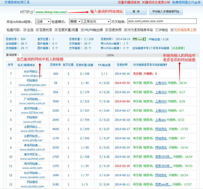 從圖上我們可以看出還可以看到對方網站的pr,百度權重以及導入導出鏈接數量,由于時間關系不在這里一一贅述,總之友情鏈接檢查工具是個好工具!